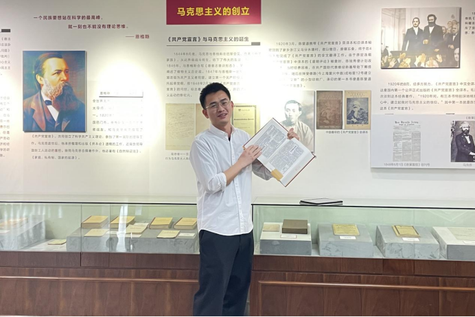 2020级研究生党员李开明以生动自然的语言向大家介绍了中国最早的以收集和传播马克思主义文献为使命的图书馆——“亢慕义斋”。他说:“作为一名共产党员,要继承革命先烈遗志,深入学习马克思主义经典著作文献,结合中国实际,用马克思主义之'矢'去射新时代中国之'的',更好地回答好'四个之问',做好新时代的马克思主义传播者,薪火相传,确保红色江山永不变色。”
